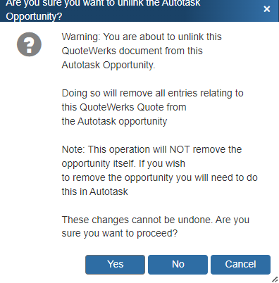 If you accidentally attached a quote to the wrong opportunity in Autotask, you can use the button to remove the link. All entries relating to the QuoteWerks Quote will be removed from the Autotask opportunity. This button will only be displayed when updating an existing opportunity, so if you realize you made a mistake, choose to update the opportunity, and then at that point, use this button to unlink it.