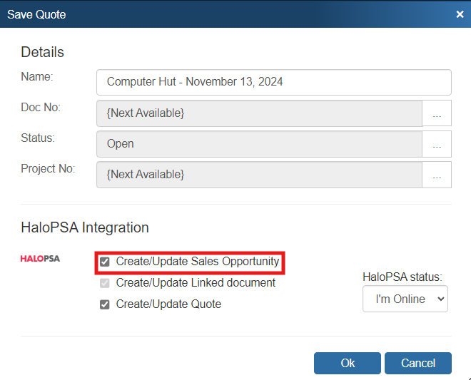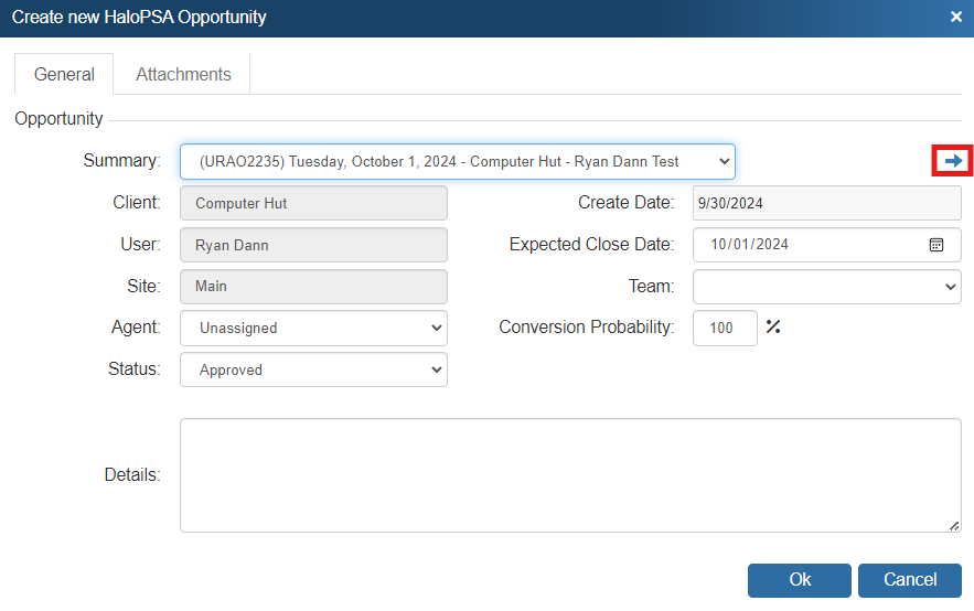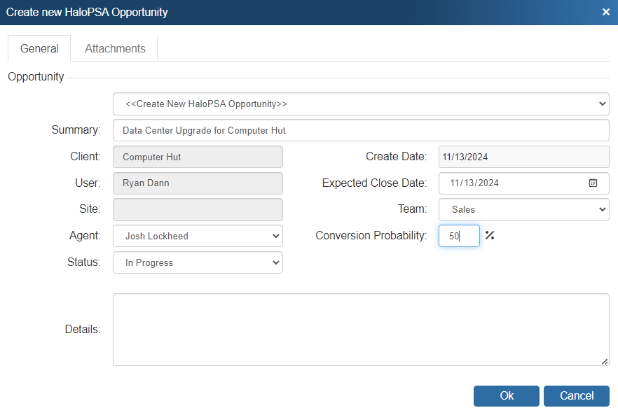 This option will create or update an HaloPSA opportunity or attach to an existing opportunity in HaloPSA.