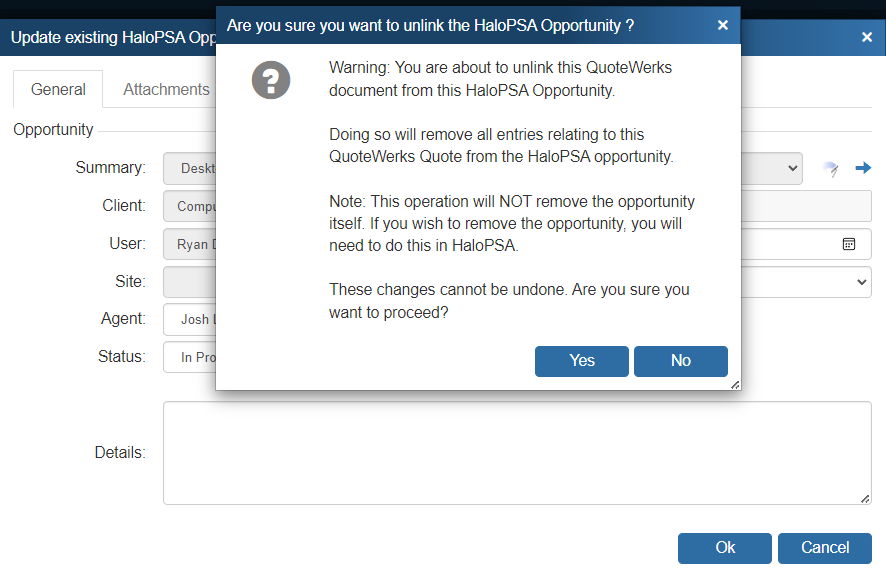QuoteWerks claims ownership of HaloPSA opportunities that were created or updated from within QuoteWerks. It is not recommended that you manually make changes to the opportunity from within HaloPSA as these changes may be overwritten by QuoteWerks when QuoteWerks is updating the HaloPSA opportunity.