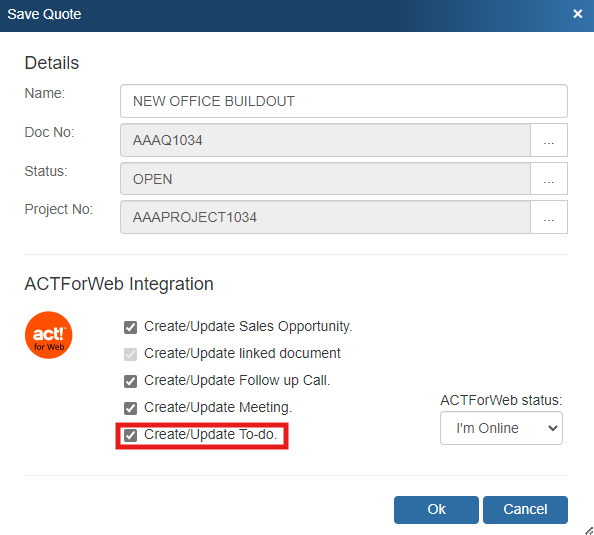 This feature will schedule a to-do activity related to this quote in ACT! for Web. By scheduling to-do items at the time you create the quote or order, you won’t ever forget to take care of all the details related to your quote or sale. The to-do item will be listed under the Activities tab in ACT! for Web.