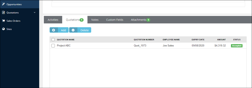 After the opportunity has been updated as Won, the quotation associated with the opportunity will be marked as "accepted" automatically.