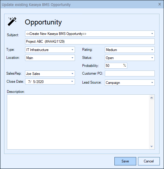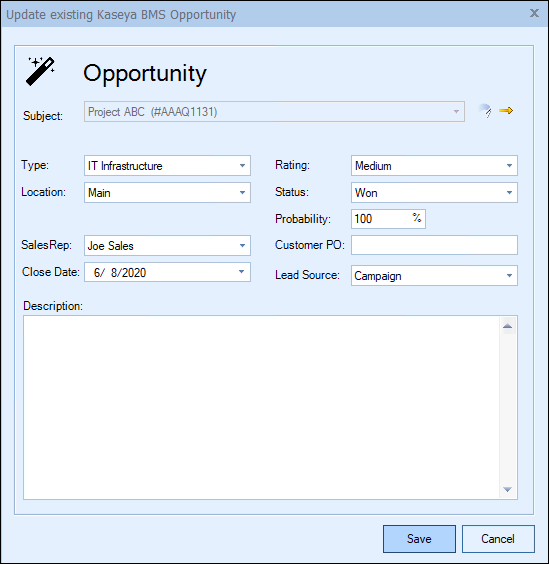 Once you have pressed the [OK] button from the File -> Save window, the “Create/Update Kaseya BMS Opportunity” window will appear, enabling you to enter or adjust information about the opportunity such as the Opportunity Name, Type, Location, SalesRep, Close Date, Rating, Status, Probability, Customer PO, Lead Source, and Description. If you have set defaults in the integration, these will be set for you, but you can adjust any of the fields as needed.
