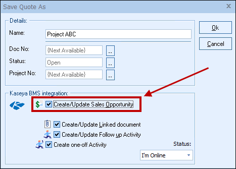 This option will create or update a Kaseya BMS opportunity in Kaseya BMS.