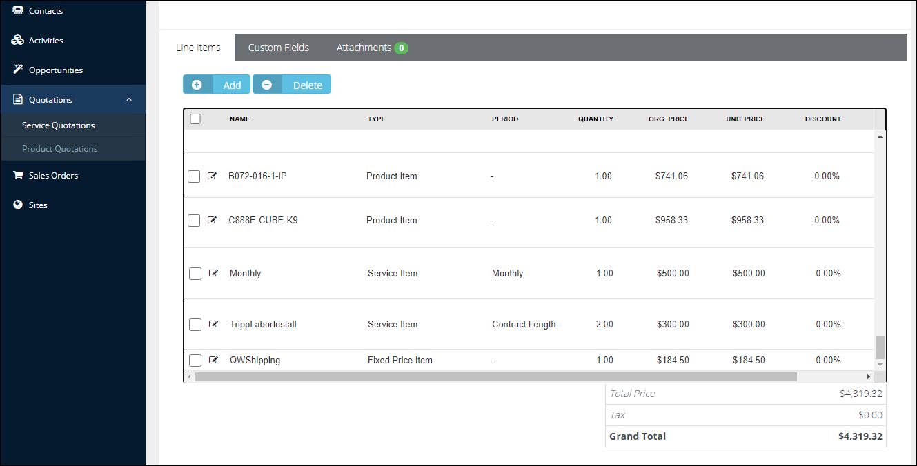 This section corresponds to the line items in the opportunity. When QuoteWerks creates the opportunity in Kaseya BMS, the line items will be written into a Kaseya BMS Quotation and attached to the Kaseya BMS Opportunity. Both products and services will be written into the quotation.