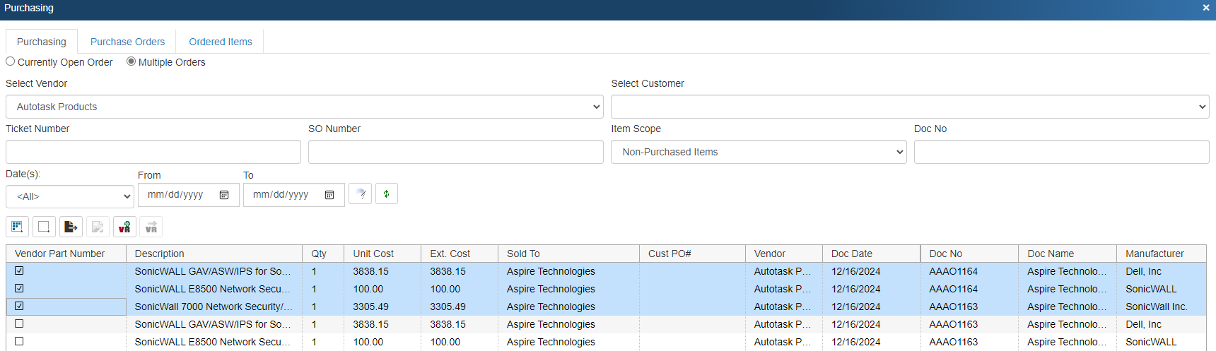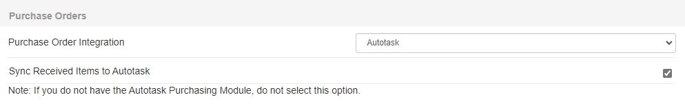 Important: Per normal Autotask behavior, once all the items on a purchase order have been received, you will not be able to edit that purchase order in Autotask. |