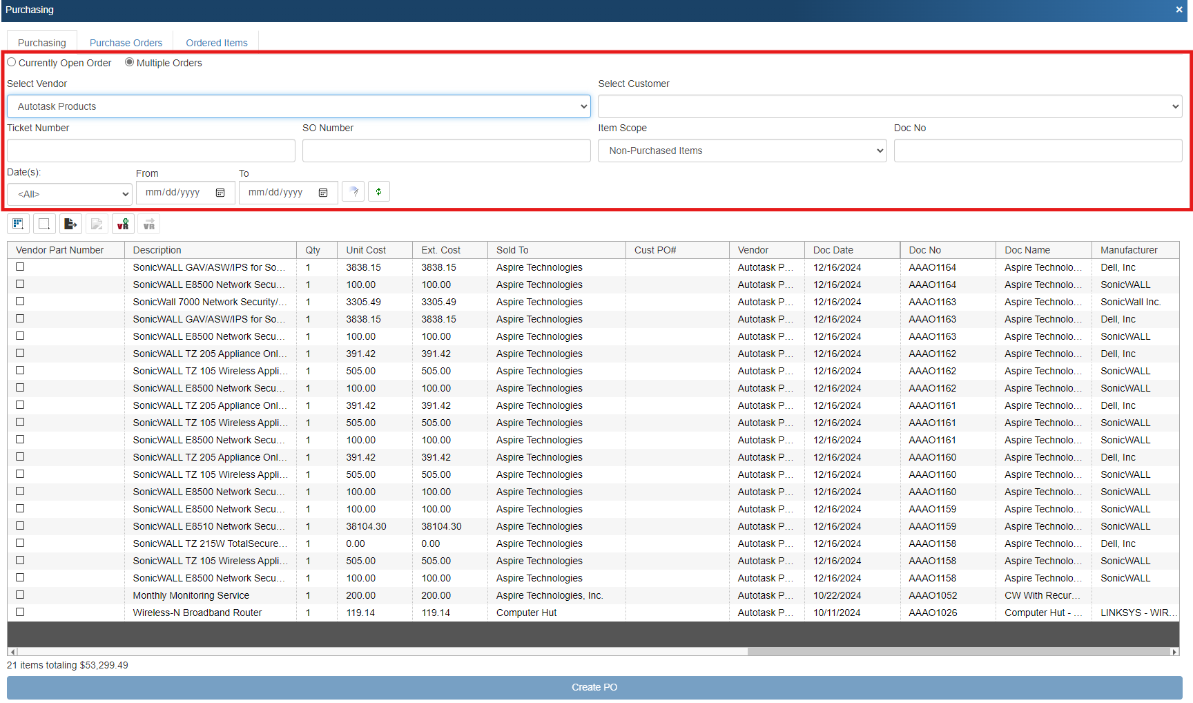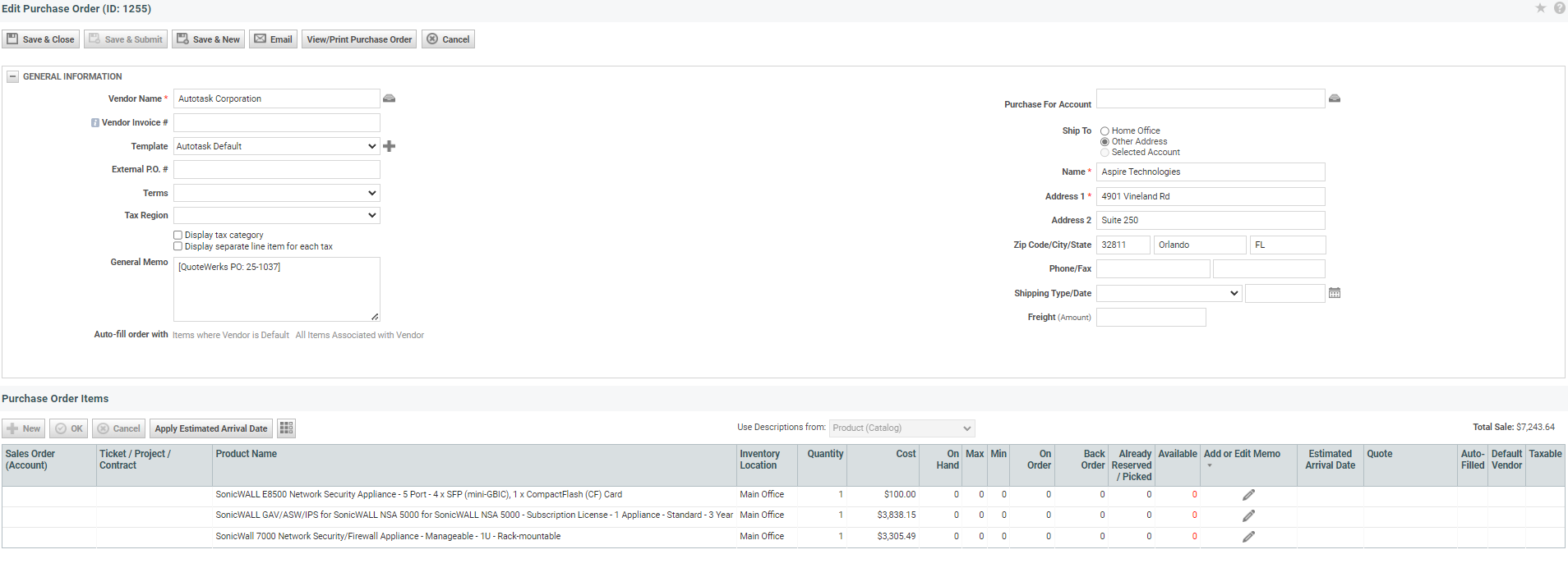 Clicking on the purchase order will open it in Autotask, listing the information about the purchase order from QuoteWerks, including a list of the purchase order's items: