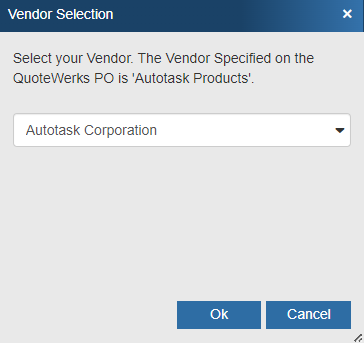 Important: If the vendor on the QuoteWerks purchase order matches a vendor in the Autotask database, this Vendor Selection window won't appear; you will skip to Step 6. |
