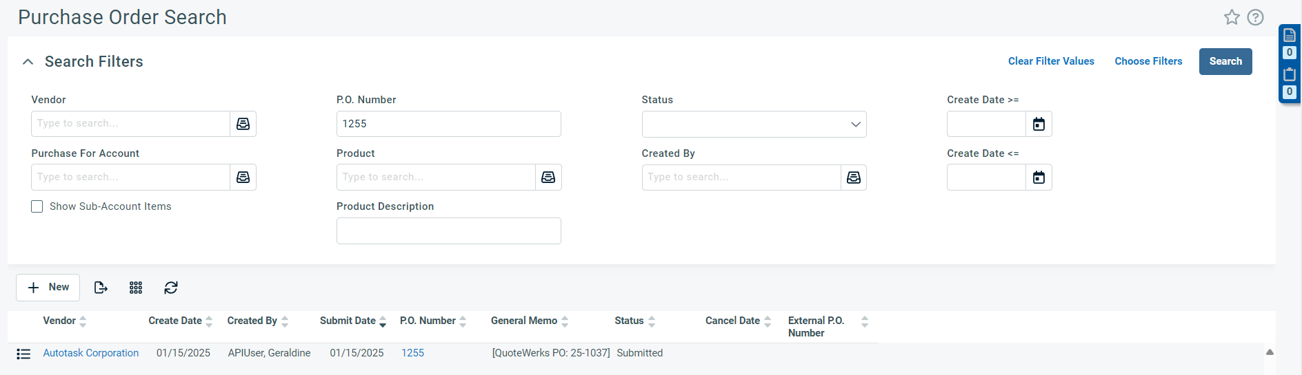 Step 8: To view the purchase order that was sent over to Autotask, open Autotask and click on the Inventory -> Purchase Orders menu. Enter your desired search parameters and hit [Enter] on your keyboard.