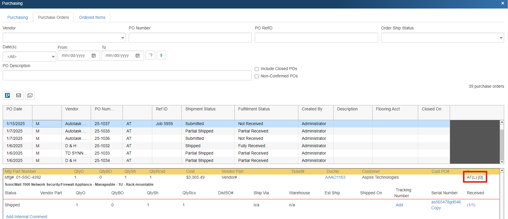 When a PO has been exported to Autotask QuoteWerks allows you to receive inventory against that PO. To learn more see Receiving Inventory.