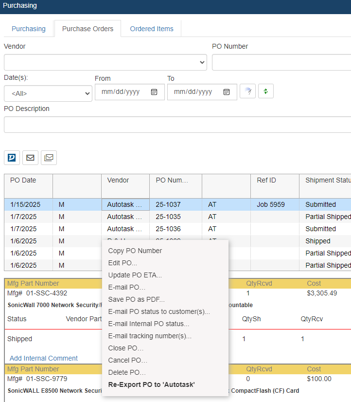 Once a PO is sent to Autotask, the option to re-export becomes available. This is useful if the original PO did not export correctly and you need to send it over to Autotask again with the corrections.