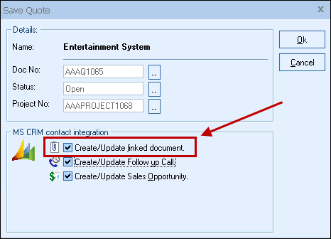 Checking this option will create a Note record for the contact and will attach a linked document as an attachment on the Notes tab of the Opportunity (MS CRM 3.0 and later only). The PDF version of the document that attaches when the email is sent to the customer will also be attached under this tab.