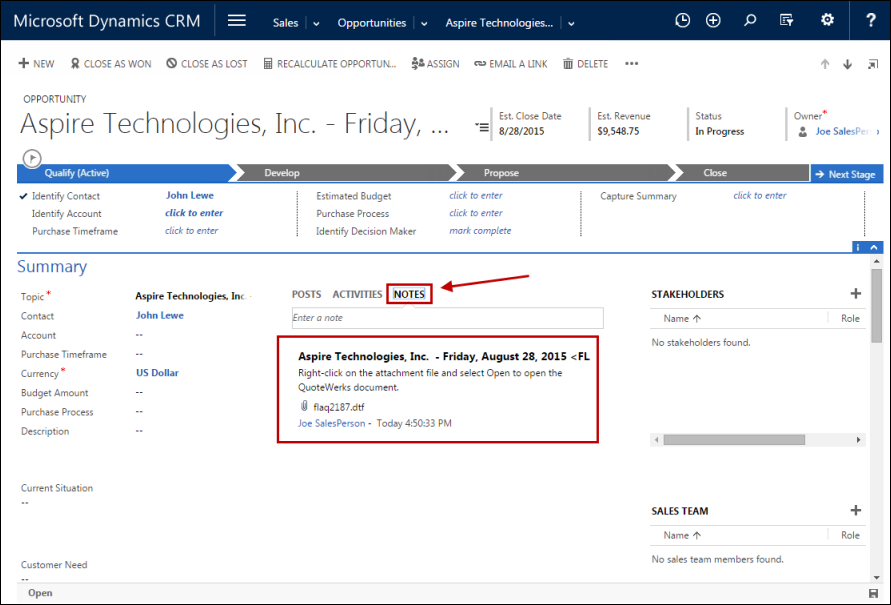When you view the note, you can right click and choose ‘Open’ to launch QuoteWerks and open that quote.