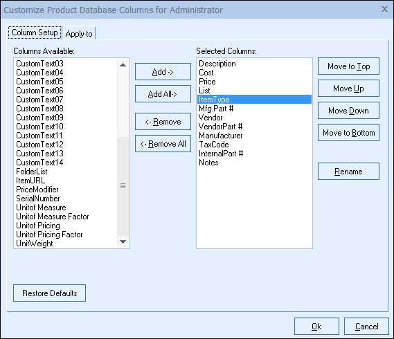 This will launch the “Customize Product Database Columns for (User Name)” window. This window has two tabs that will allow you customize the database columns for the selected pricelist.