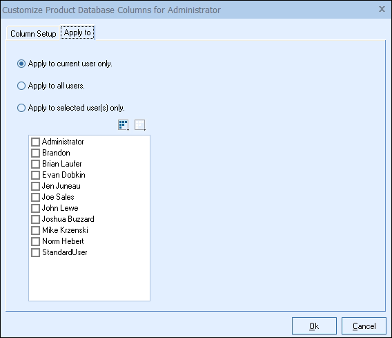 If you have Master Rights, then an Apply to tab will be visible and will give you the option to apply these column changes to the current user, all users, or a list of selected users.