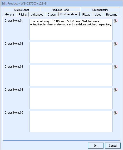 The Custom Memo fields could be used to hold alternate language descriptions. In addition, Custom Memo fields can hold 32,000 characters of text. The Custom Memo fields allow for extended descriptions of items including marketing summaries or more technical information that you would like to include.