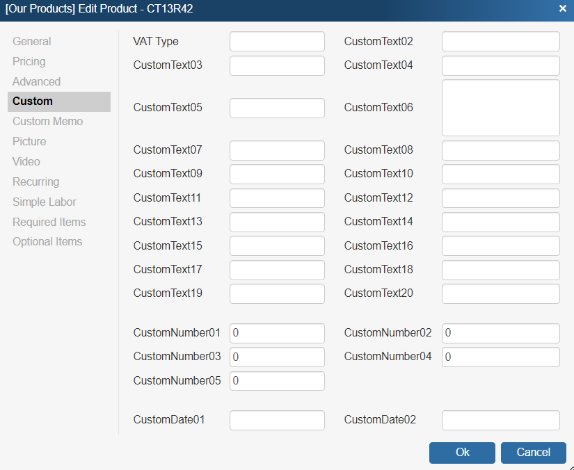 Each product has many data fields, which allow you to store information about the product. Since all businesses sell different products and services, there are 14 custom text, 5 custom number, 2 custom date, and 2 custom memo fields on the Custom tab which allow you to store custom information that there is not already a data field for.