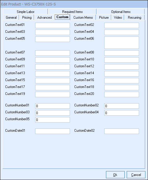 Each product has many data fields, which allow you to store information about the product. Since all businesses sell different products and services, there are 14 custom text, 5 custom number, 2 custom date, and 2 custom memo fields on the Custom tab which allow you to store custom information that there is not already a data field for.