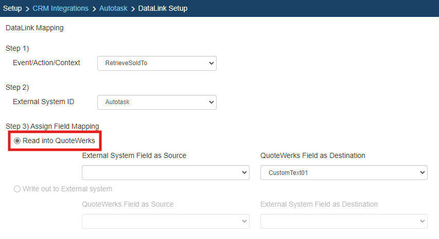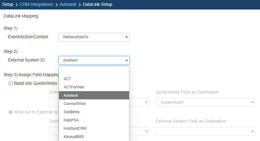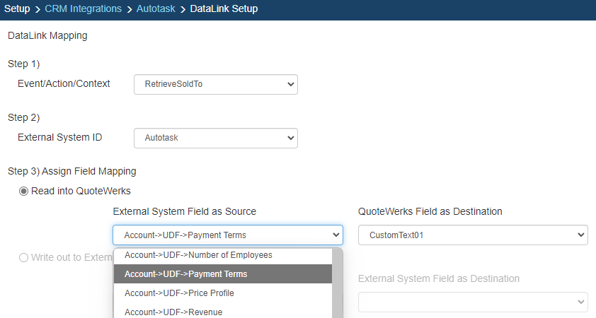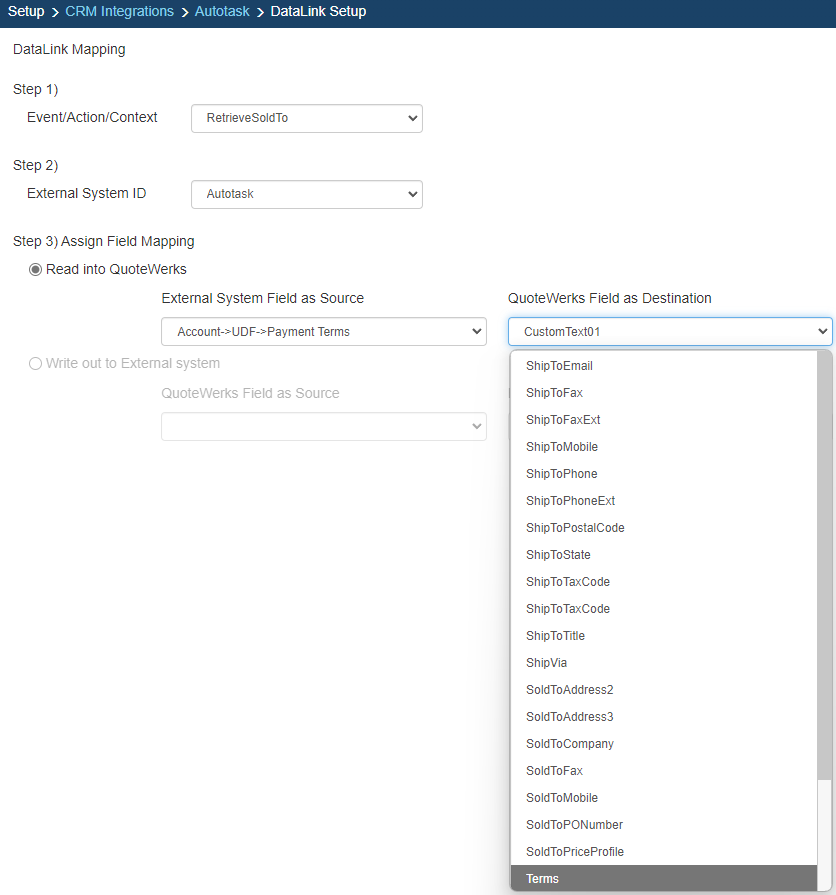 Step 6: Once your External field as source is selected, choose the QuoteWerks field that you would like the data from Autotask to populate in the QuoteWerks Field as a Destination.