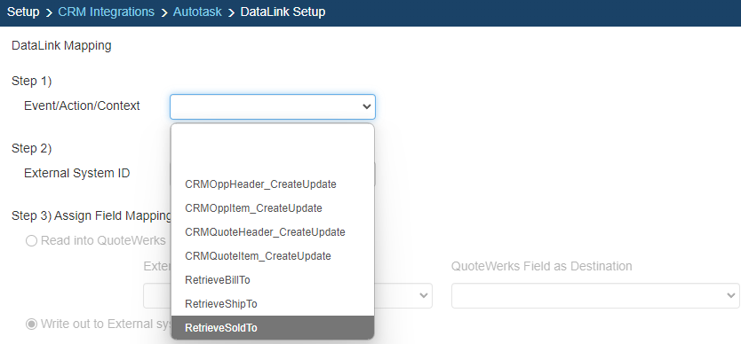 Step 2: On the next window (DataLink Mapping), change the first drop-down menu to RetrieveSoldTo, RetrieveShipTo, or RetrieveBillTo. Your selection here will determine when the field from your Autotask is pulled into QuoteWerks (i.e. the filed data is pulled in when pulling the contact details into the Sold to, Ship to, or Bill to fields).