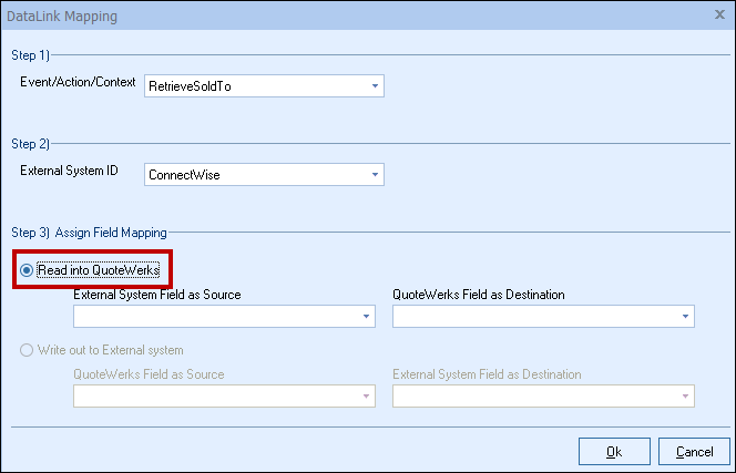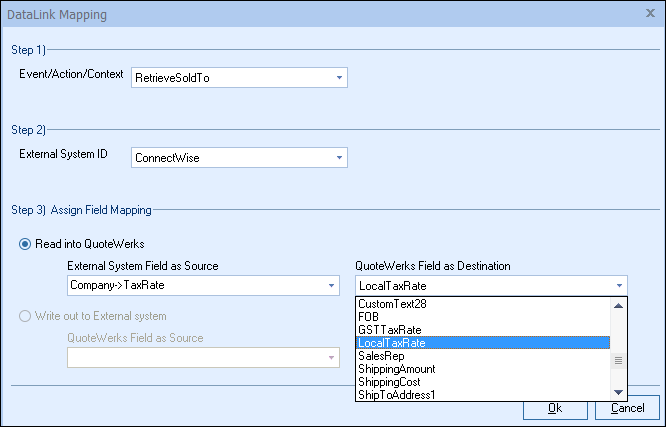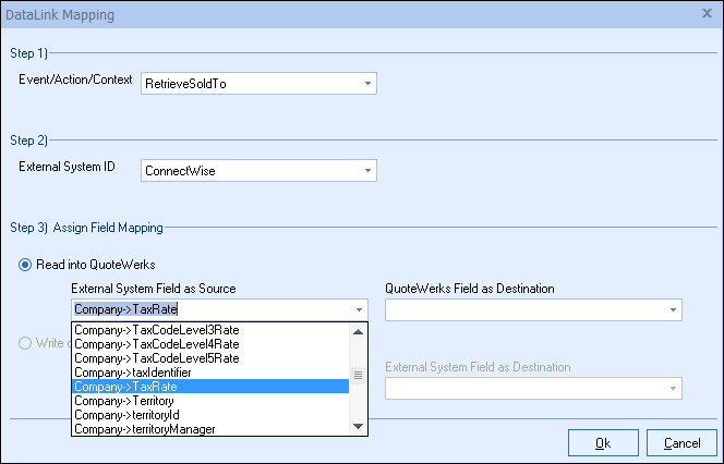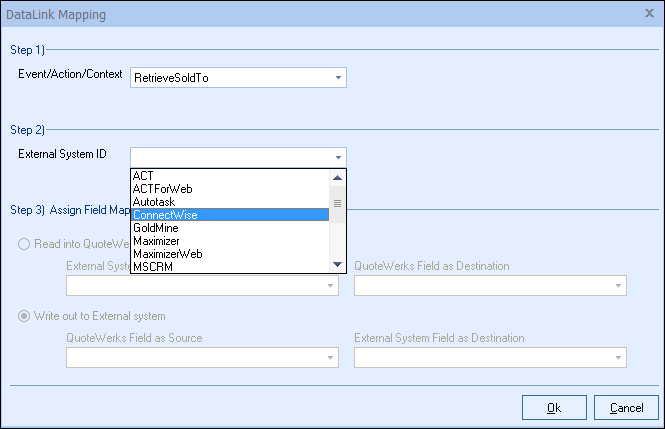 Step 6: Once your External field as source is selected, choose the QuoteWerks field that you would like the data from ConnectWise to populate in the QuoteWerks Field as a Destination.