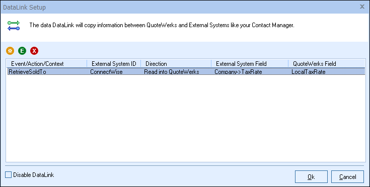 In the following example we are going to walk through how to pull the tax rate field from the QuoteWerks contact database and have it populate the tax rate field on the Sale Info tab. You can pull this and many other fields through the DataLink mapping window. You will need to create a new DataLink for each field you would like to populate however.