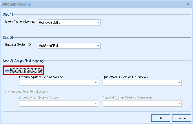 Step 4: On the next field of Assign Field Mapping click on the radial button for Read into QuoteWerks.