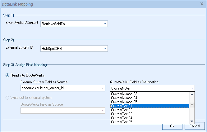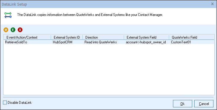 In the following example we are going to walk through how to pull the HubSpot Owner ID field from HubSpot CRM and have it populate a CustomText field in QuoteWerks. You can pull this and many other fields through the DataLink mapping window. You will need to create a new DataLink for each field you would like to populate however.