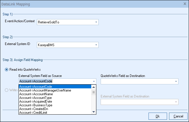 Step 2: On the next window (DataLink Mapping), change the first drop-down menu to RetrieveSoldTo, RetrieveShipTo, or RetrieveBillTo. Your selection here will determine when the field from your CRM/PSA is pulled into QuoteWerks (i.e. the field data is pulled in when pulling the contact details into the Sold to, Ship to, or Bill to fields).