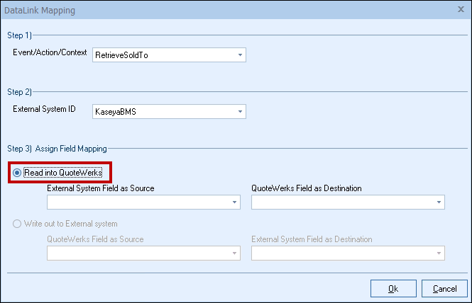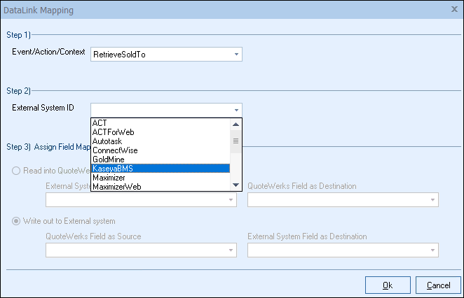 Step 6: Once your External field as source is selected, choose the QuoteWerks field that you would like the data from Kaseya BMS to populate in the QuoteWerks Field as a Destination.
