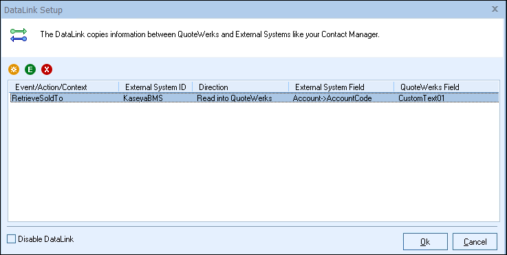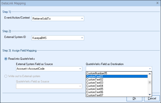In the following example we are going to walk through how to pull the Account Code field from Kaseya BMS and have it populate a CustomText field in QuoteWerks. You can pull this and many other fields through the DataLink mapping window. You will need to create a new DataLink for each field you would like to populate however.