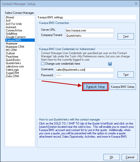 Follow these instructions for setting up the DataLink to pull additional Kaseya BMS fields into your QuoteWerks document.
