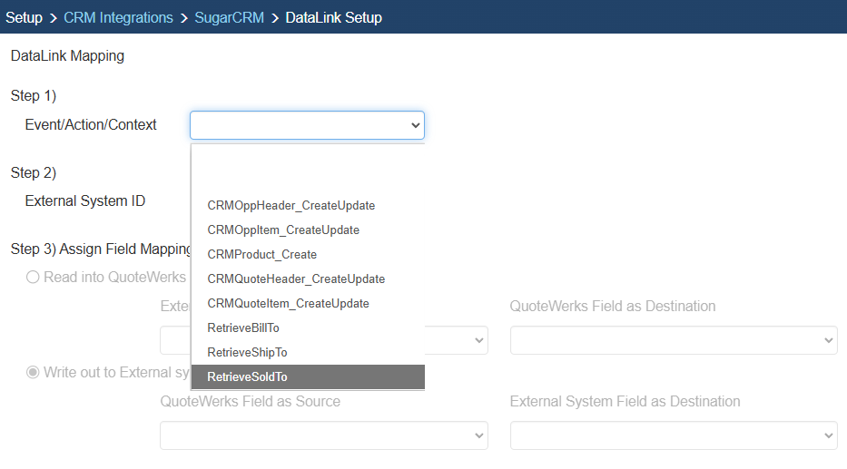 Step 2: On the next window (DataLink Mapping), change the first drop-down menu to RetrieveSoldTo, RetrieveShipTo, or RetrieveBillTo. Your selection here will determine when the field from your CRM/PSA is pulled into QuoteWerks (i.e. the filed data is pulled in when pulling the contact details into the Sold to, Ship to, or Bill to fields).