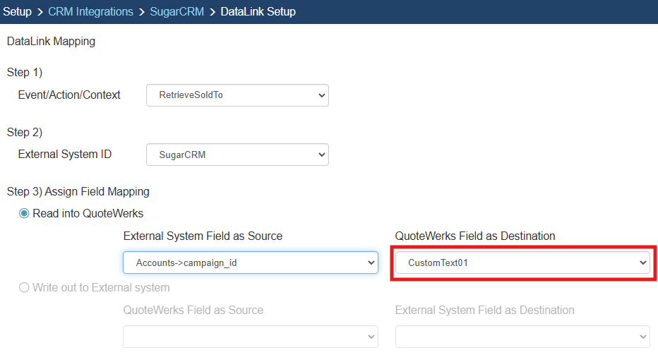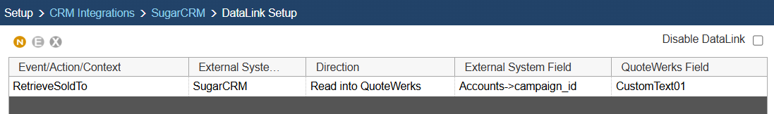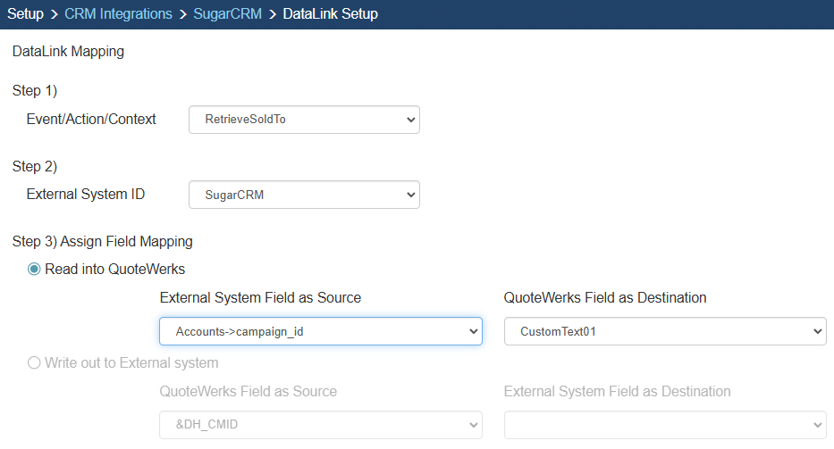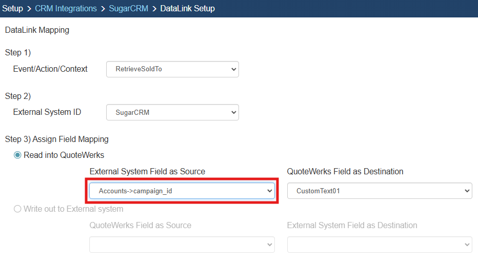 In the following example we are going to walk through how to pull the Campaign ID field from SugarCRM and have it populate a Custom field in QuoteWerks. You can pull this and many other fields through the DataLink mapping window. You will need to create a new DataLink for each field you would like to populate however.