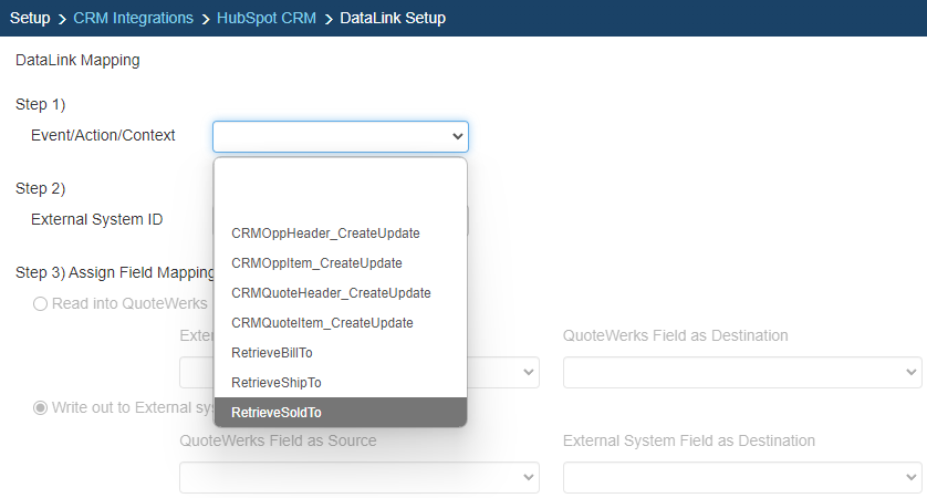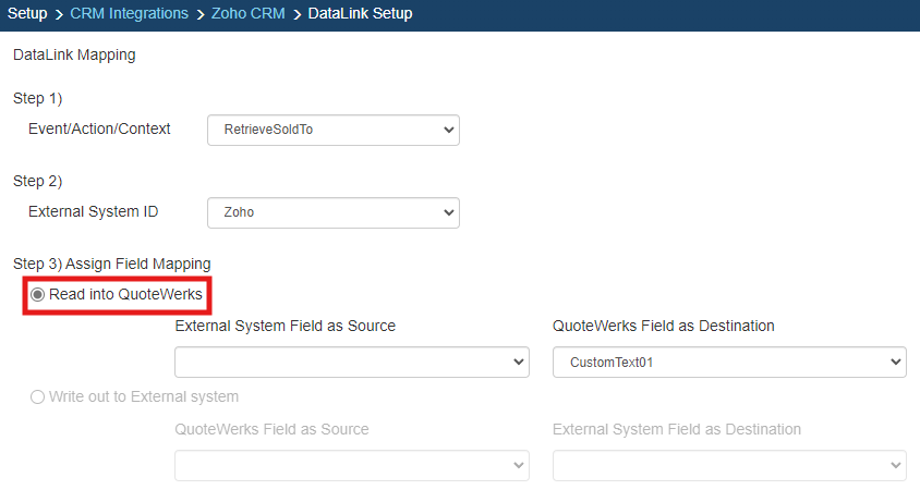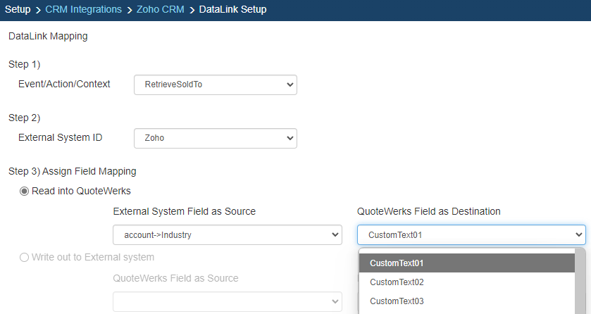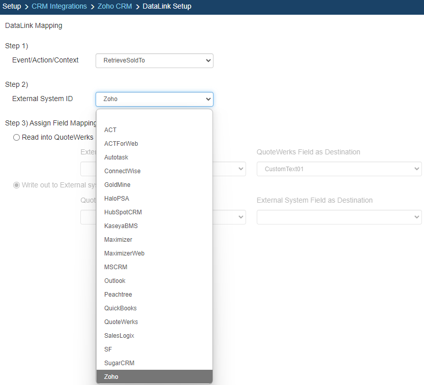 Step 6: Once your External field as source is selected, choose the QuoteWerks field that you would like the data from Zoho to populate in the QuoteWerks Field as a Destination.