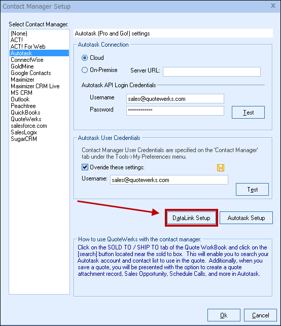 To setup the DataLink, click on Contacts-> Setup Contact Manager menu selection. Highlight (if not already highlighted) Autotask and click on the [DataLink Setup] button on the window.
