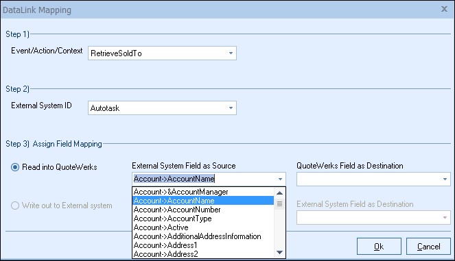 Step 6: Once your QuoteWerks Field as Source is selected, choose the Autotask field that you would like the data from QuoteWerks to populate in the External System Field as Destination.