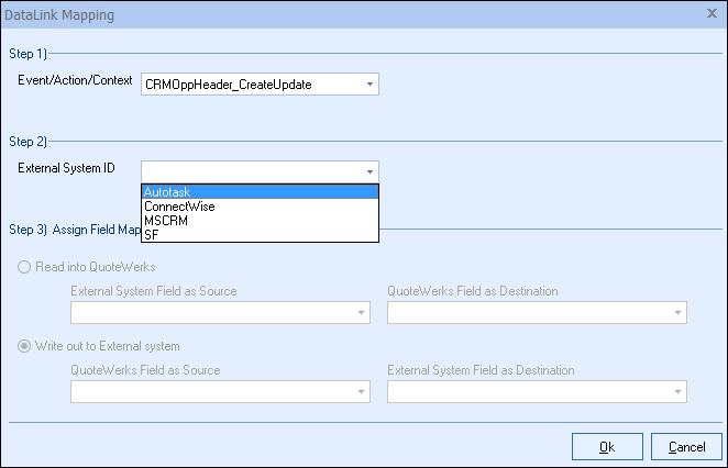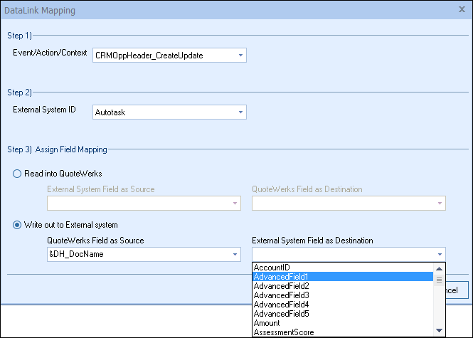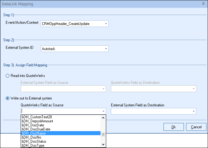 Step 2: On the next window (DataLink Mapping), change the first drop-down menu to CRMOppHeader_CreateUpdate to choose to push a DocumentHeader field from QuoteWerks to the Autotask Opportunity or CRMOppItem_CreateUpdate to push a DocumentItem field from QuoteWerks to Autotask opportunity.