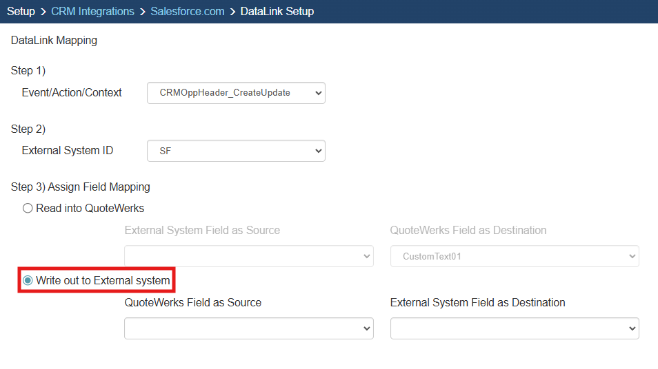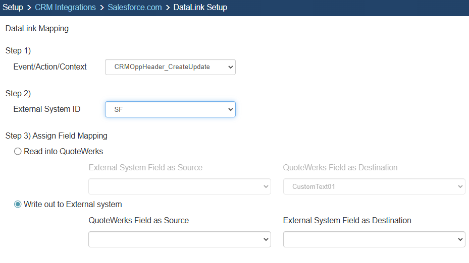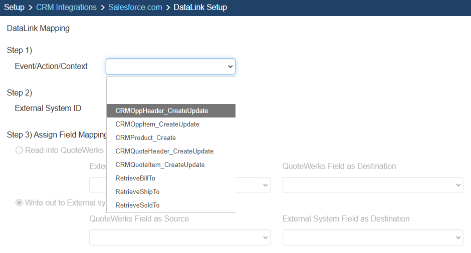 Step 2: On the next window (DataLink Mapping), change the first drop-down menu to CRMOppHeader_CreateUpdate to choose to push a DocumentHeader field from QuoteWerks to salesforce.com. To push specific line item information, select CRMOppItem_CreateUpdate option. Your selection here will determine the table that QuoteWerks will use to push data into the salesforce.com opportunity.