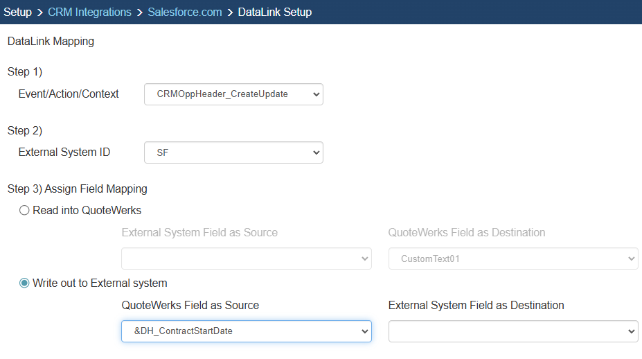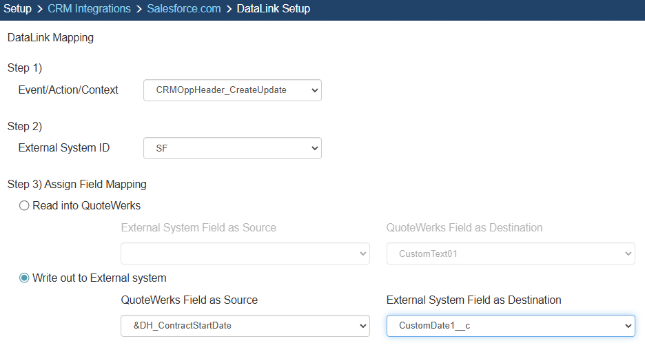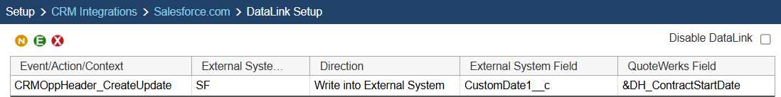 In the following example we are going to walk through how to push a contract date from QuoteWerks and have it populate a Custom Field in salesforce.com. You can push other fields through the DataLink mapping window. You will need to create a new DataLink for each field you would like to populate however.