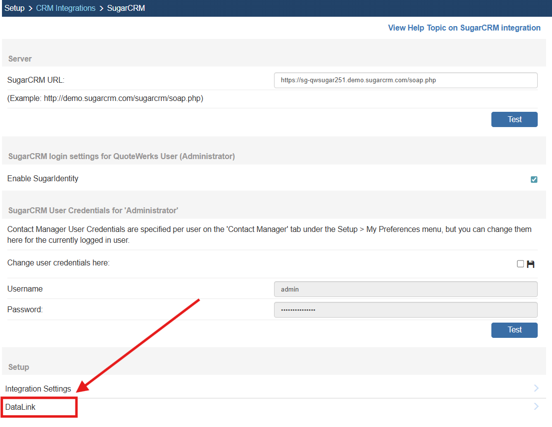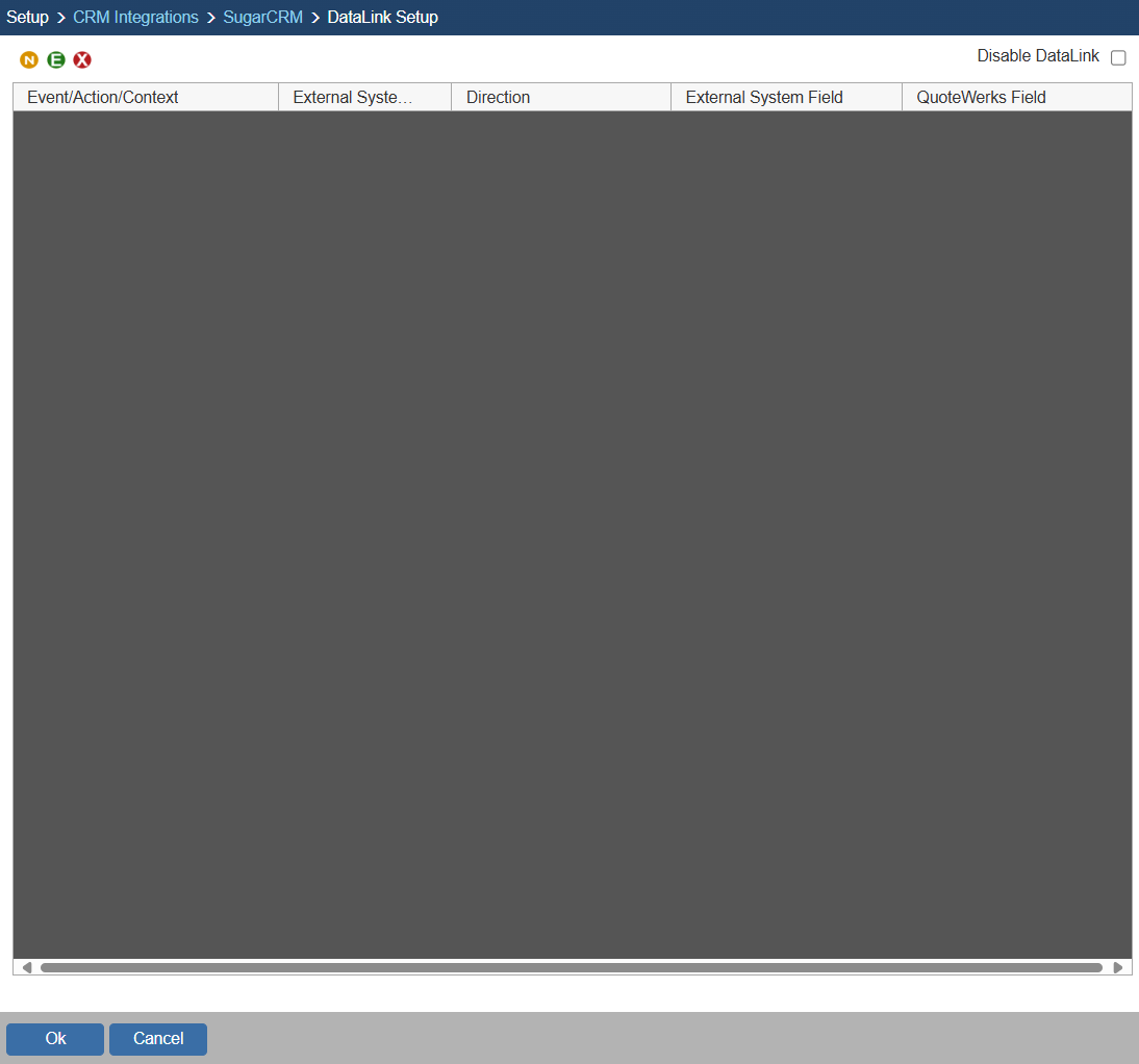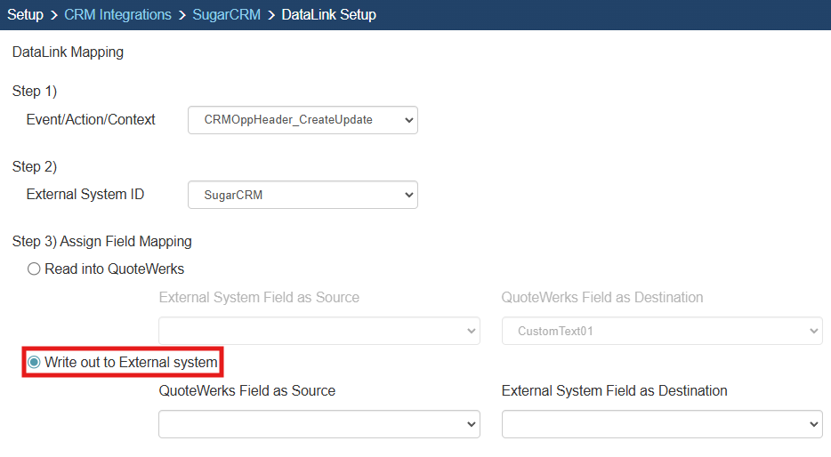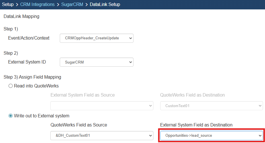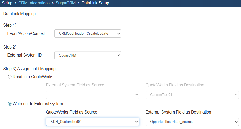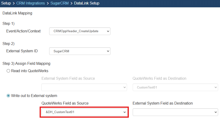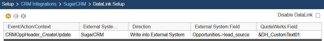 In the following example we are going to walk through how to push data from CustomText01 from QuoteWerks and have it populate a Field in SugarCRM. You can push other fields through the DataLink mapping window. You will need to create a new DataLink for each field you would like to populate however.
