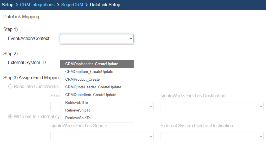 Step 2: On the next window (DataLink Mapping), change the first drop-down menu to CRMOppHeader_CreateUpdate to choose to push a DocumentHeader field from QuoteWerks to SugarCRM. To push specific line item information, select CRMOppItem_CreateUpdate option. Your selection here will determine the table that QuoteWerks will use to push data into SugarCRM.