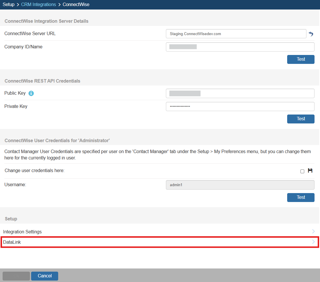 To setup the DataLink, click on Contacts-> Setup Contact Manager menu selection. Click on ConnectWise and click on [DataLink] at the bottom of the window.