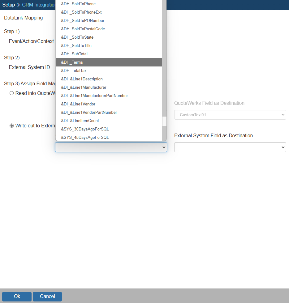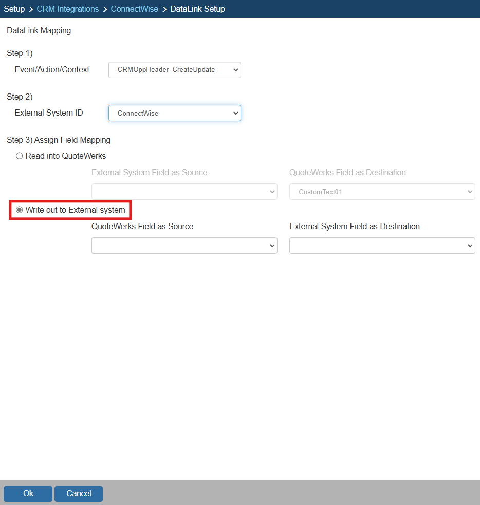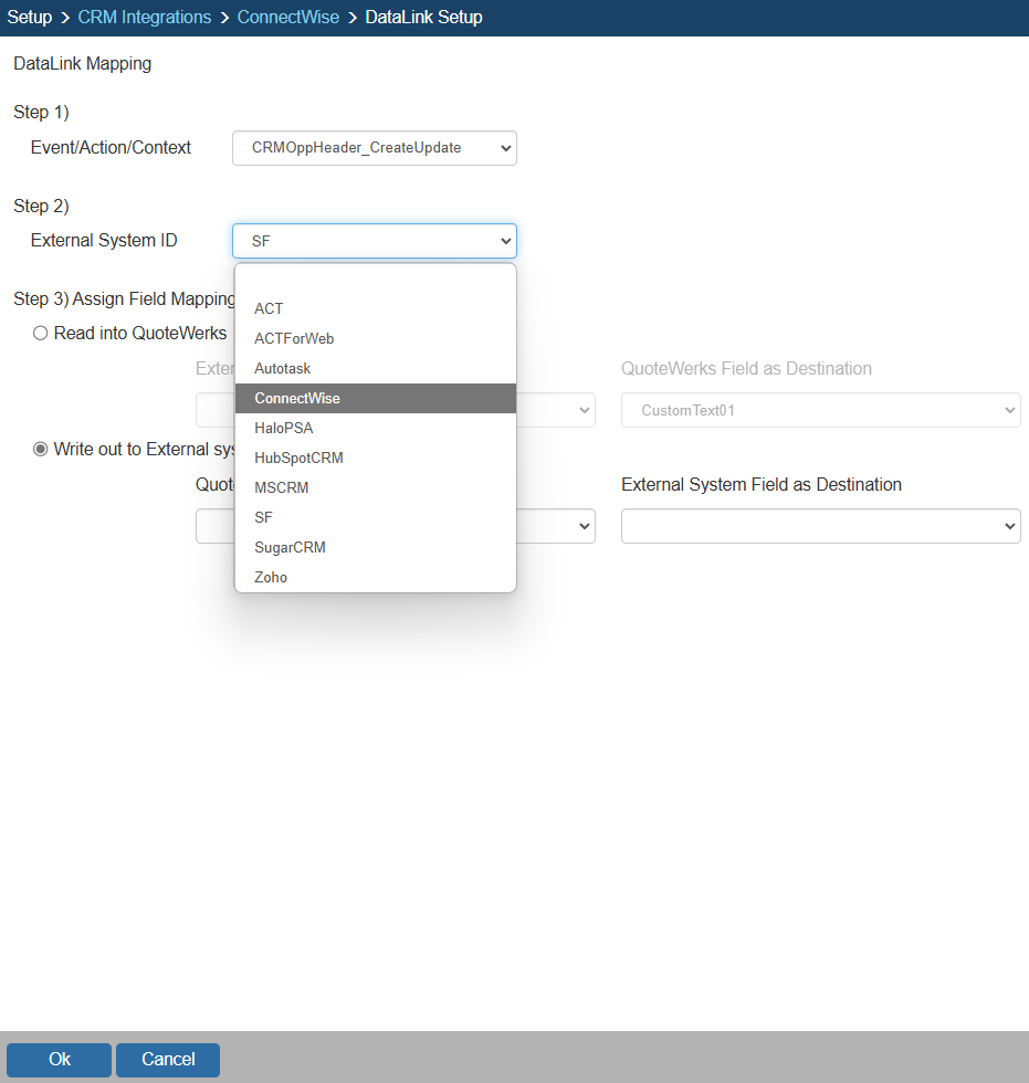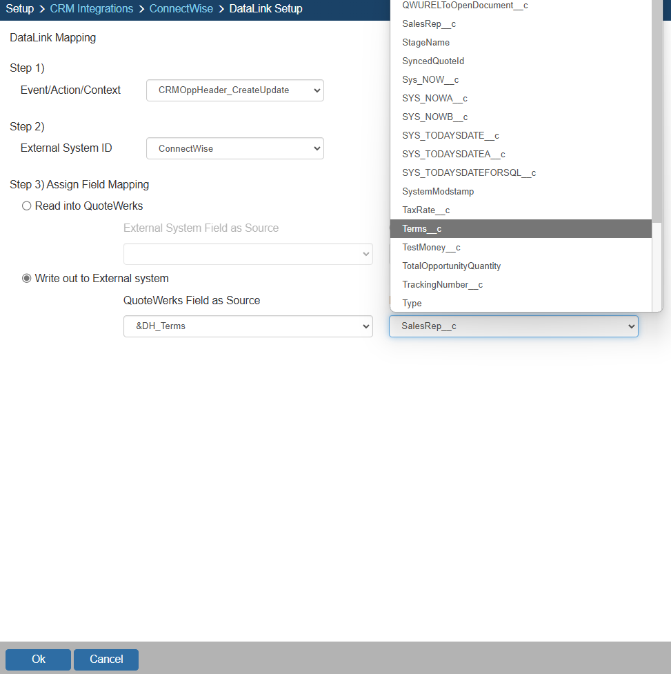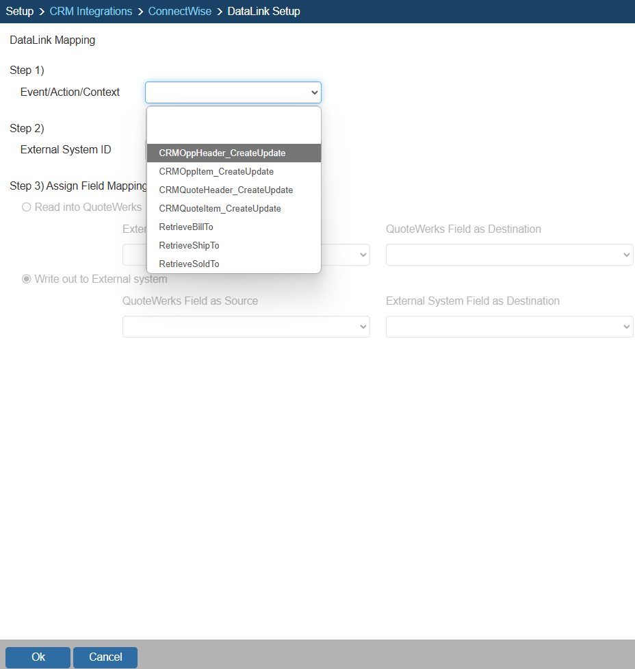 Step 2: On the next window (DataLink Mapping), change the first drop-down menu to CRMOppHeader_CreateUpdate to choose to push a DocumentHeader field from QuoteWerks to ConnectWise. To push specific line item information, select CRMOppItem_CreateUpdate option. Your selection here will determine the table that QuoteWerks will use to push data into ConnectWise.