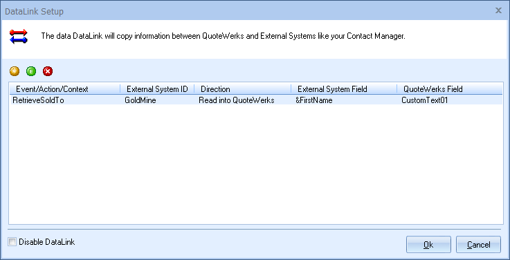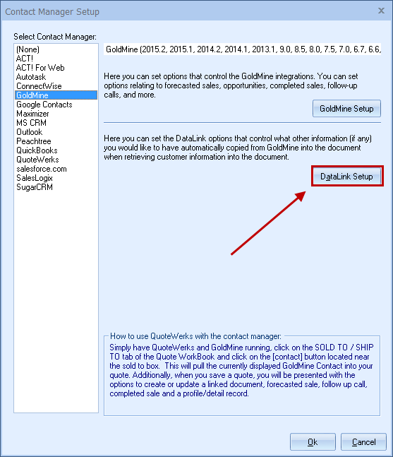 The DataLink feature allows you to pull additional information from fields in GoldMine when retrieving the contact information. This data from GoldMine can be used to complete fields in the QuoteWerks document such as a customer profile, the tax rate, customer terms, custom fields, etc. for the customer. Clicking on the [DataLink Setup] button on the Contact Manager Setup window will display the DataLink setup window.