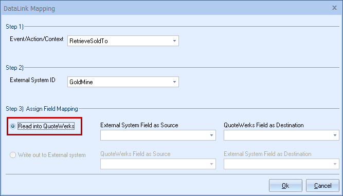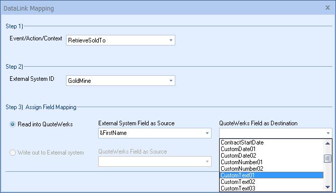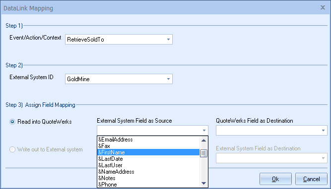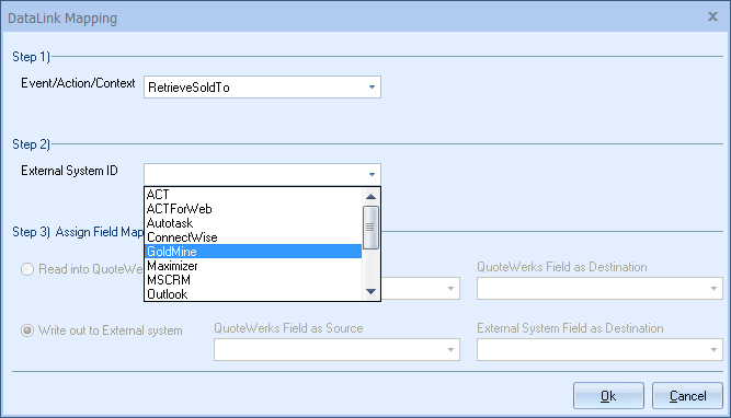 Step 6: Once your External field as source is selected, choose the QuoteWerks field that you would like the data from GoldMine to populate in the QuoteWerks Field as a Destination.