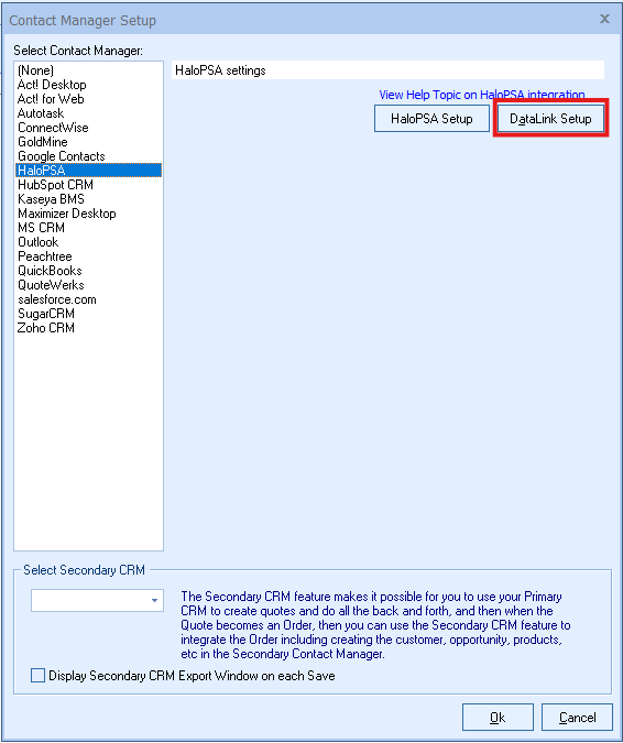 To setup the DataLink, click on Contacts-> Setup Contact Manager menu selection.  Highlight (if not already highlighted) your CRM/PSA and click on the [DataLink Setup] button on the right hand side of the window.
