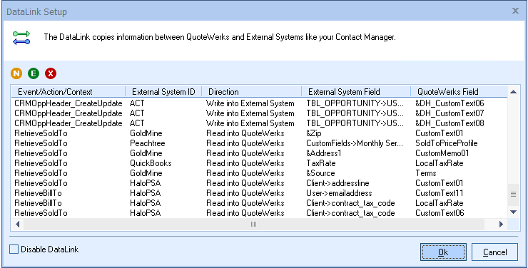 The DataLink feature allows you to pull additional information from fields in your contact manager when retrieving the contact information from your contact manager. This data from your contact manager can be used to complete fields in the QuoteWerks document such as a customer profile, the tax rate, customer terms, custom fields, etc. for the customer. Clicking on the [DataLink Setup] button on the Contact Manager Setup window will display the DataLink setup window.