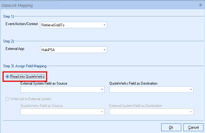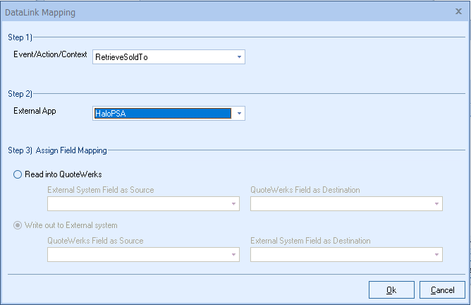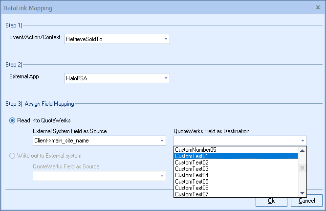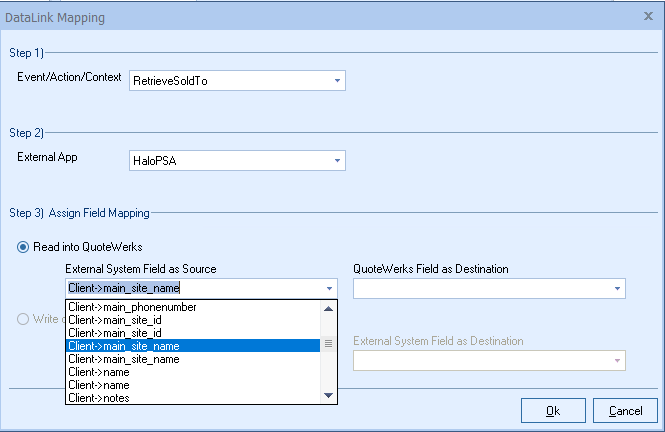Step 6: Once your External field as source is selected, choose the QuoteWerks field that you would like the data from your CRM/PSA to populate in the QuoteWerks Field as a Destination.