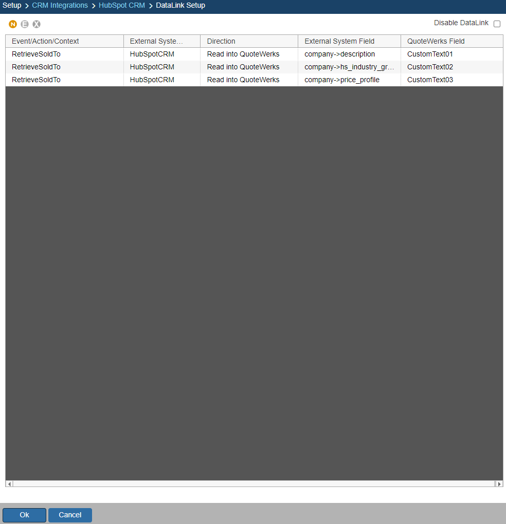 The DataLink feature allows you to pull additional data from specified fields in HubSpot CRM. This data from HubSpot CRM can be used to complete fields in the QuoteWerks document such as account information, customer terms, custom fields, etc. for the customer.