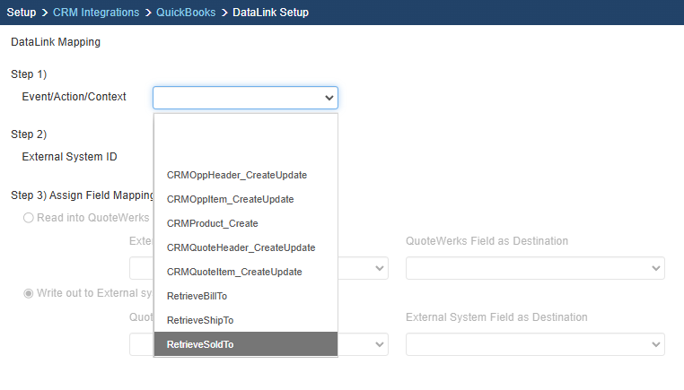 Step 2: On the next window (DataLink Mapping), change the first drop-down menu to RetrieveSoldTo, RetrieveShipTo, or RetrieveBillTo. Your selection here will determine when the field from your CRM/PSA is pulled into QuoteWerks (i.e. the filed data is pulled in when pulling the contact details into the Sold to, Ship to, or Bill to fields).